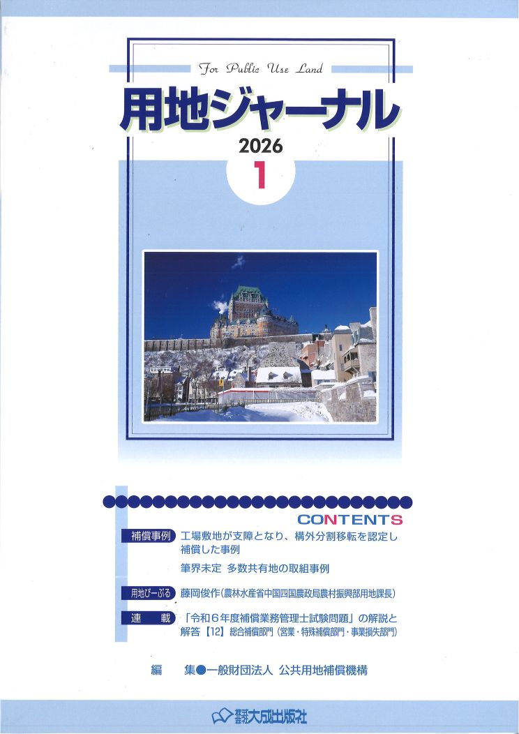 平成4年4月に創刊されて以来、主として、公共用地取得に携わる公共機関、補償コンサルタント業界等の実務家の方々や研究者を対象に、公共用地の取得・補償・収用等に関する論文、事例紹介、制度開設、最新の行政情報などの記事を掲載。